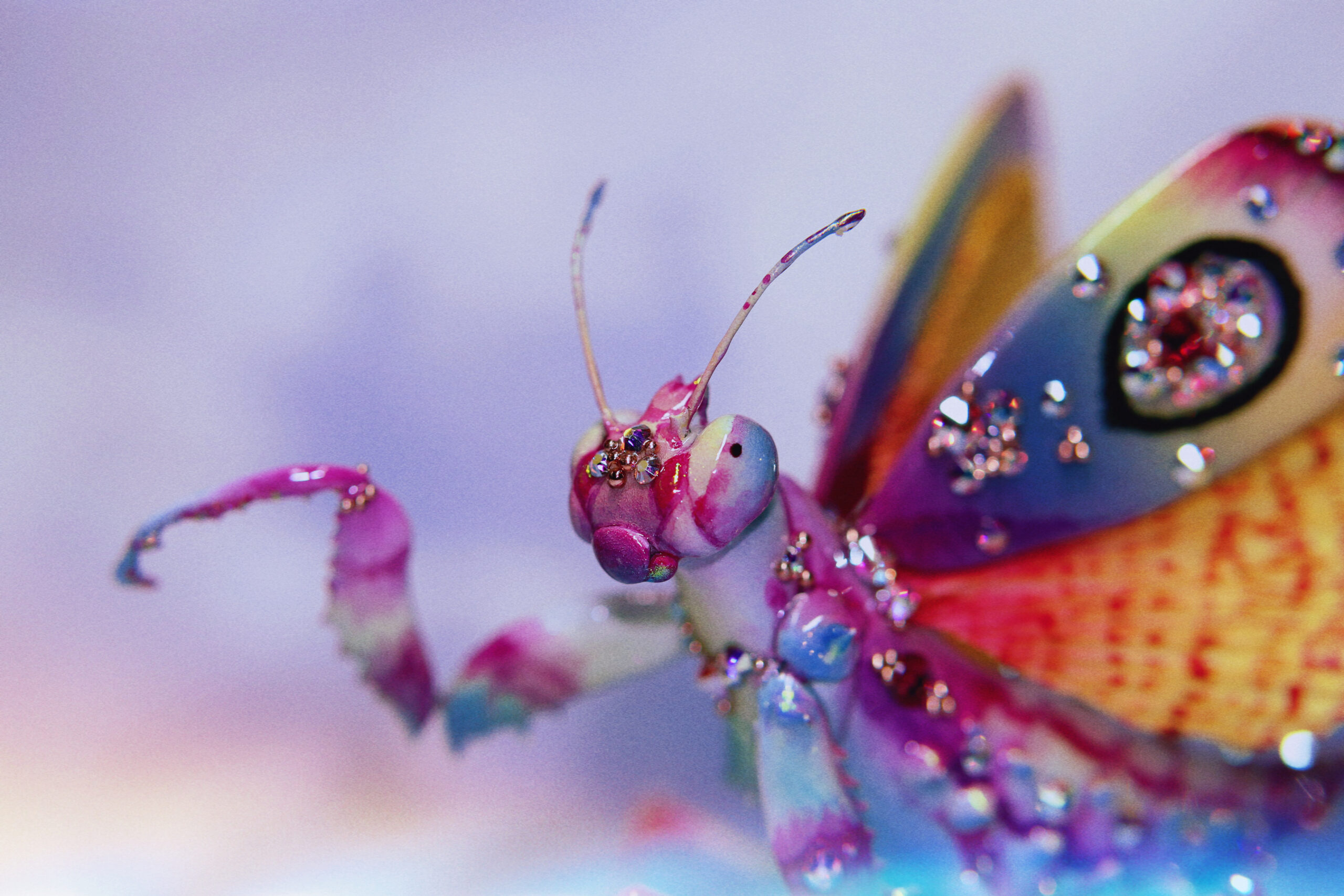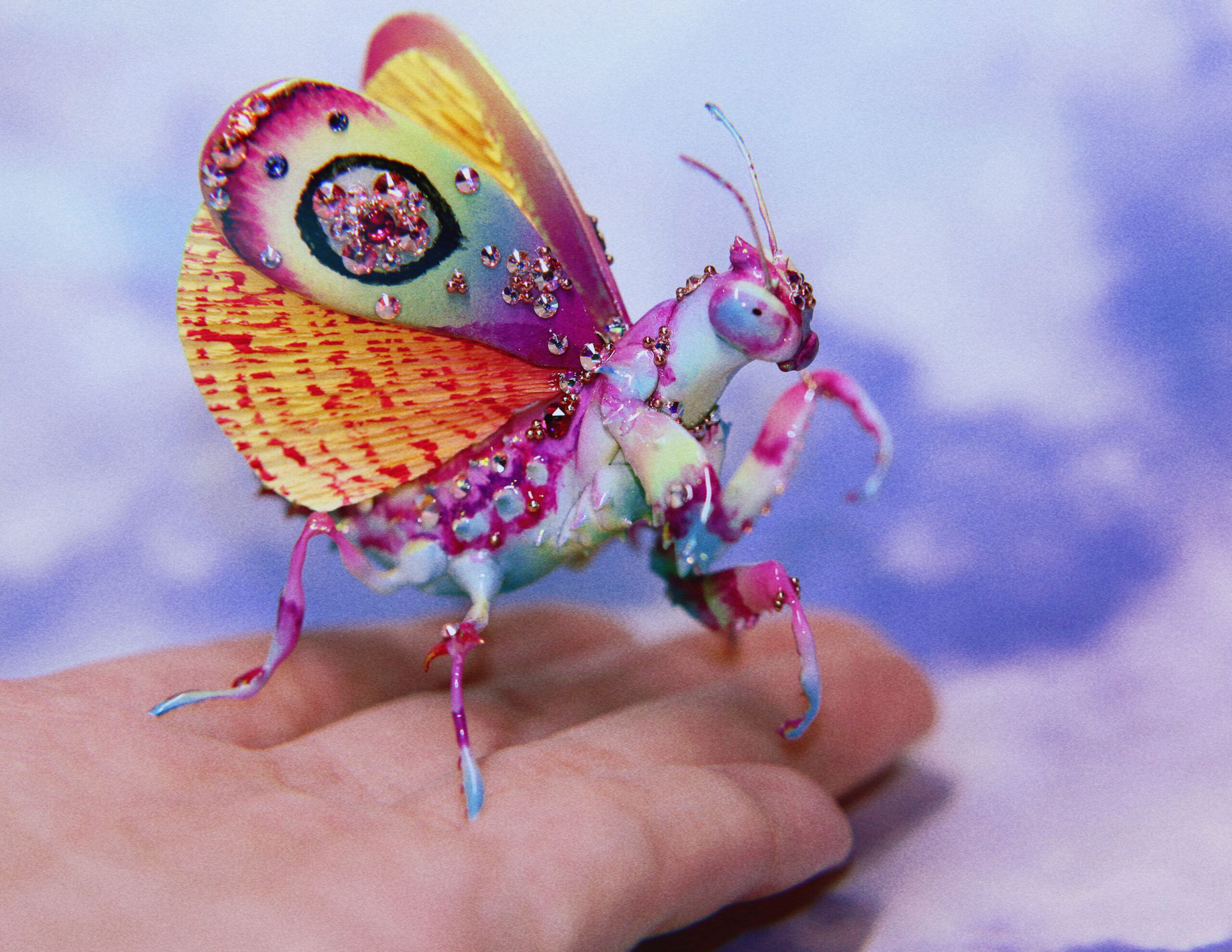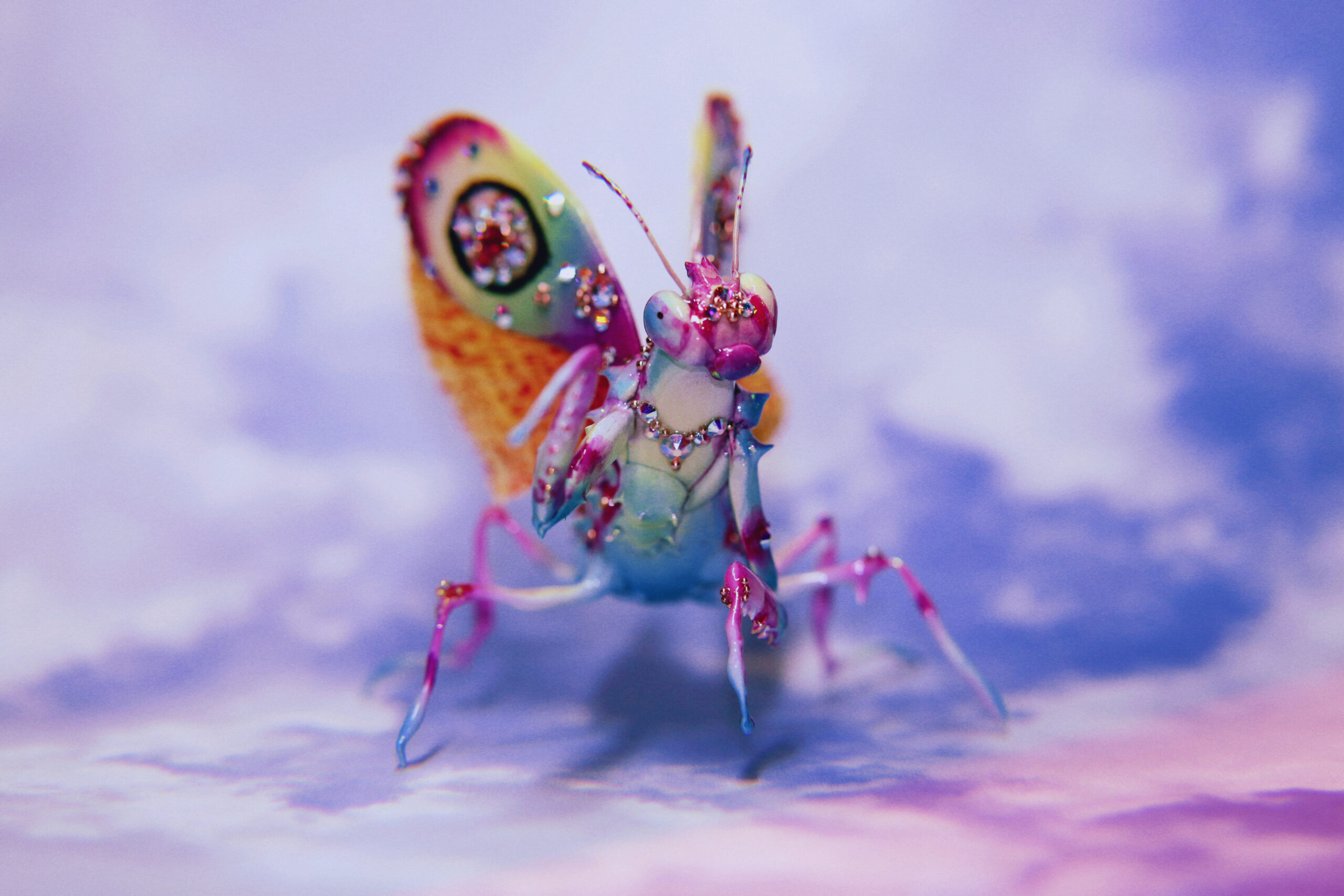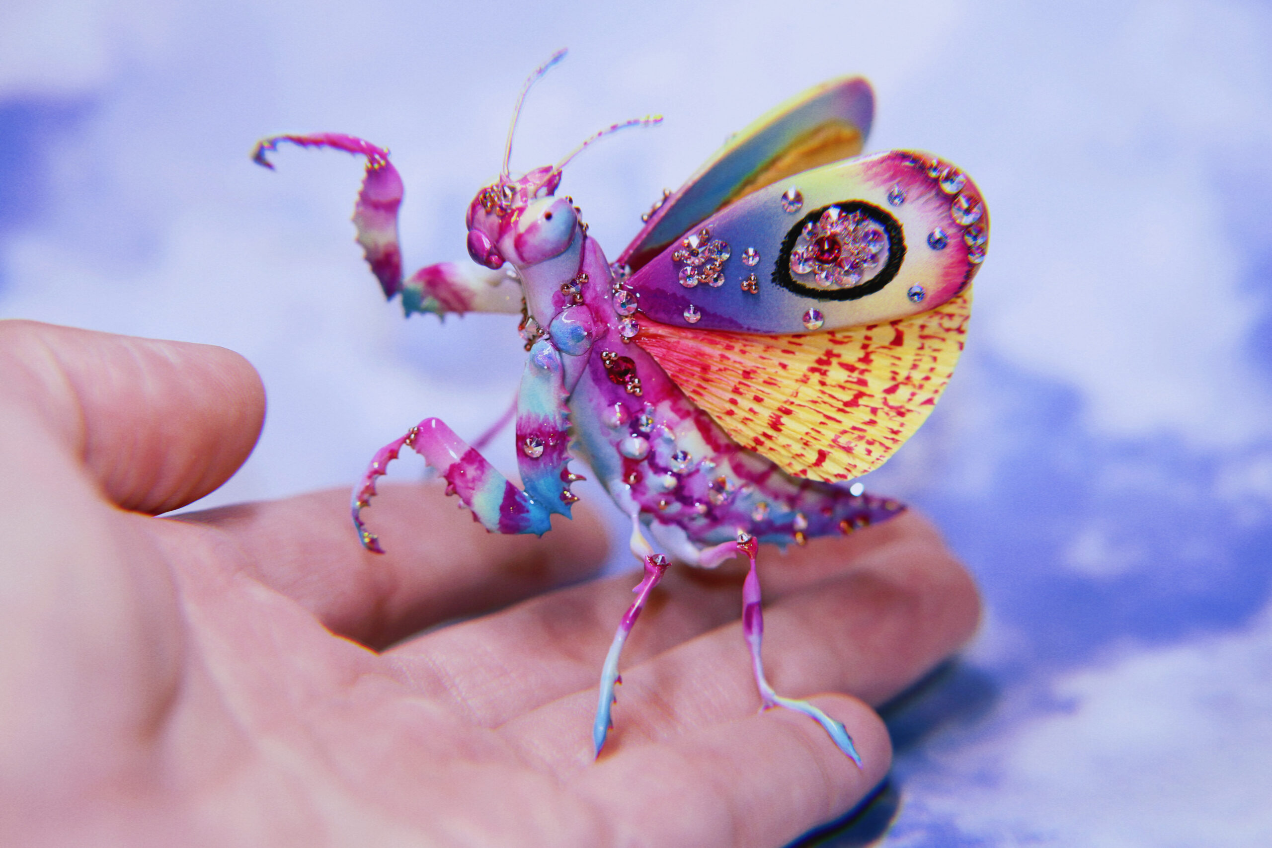This piece took countless hours of patience, layering, and steady hands to bring to life. Every tiny gem, every gradient of color, and every painted detail was done with extreme care — often taking several tries to get it just right. What may look like effortless beauty now was built through long nights, trial and error, and the quiet rhythm of focus. I wanted this jeweled mantis to feel alive — like a small creature born from dreams and light — and finding that perfect balance between delicate and striking was no easy task. But that’s the magic of creating art: the process tests your limits, and the result reminds you why you never gave up.
