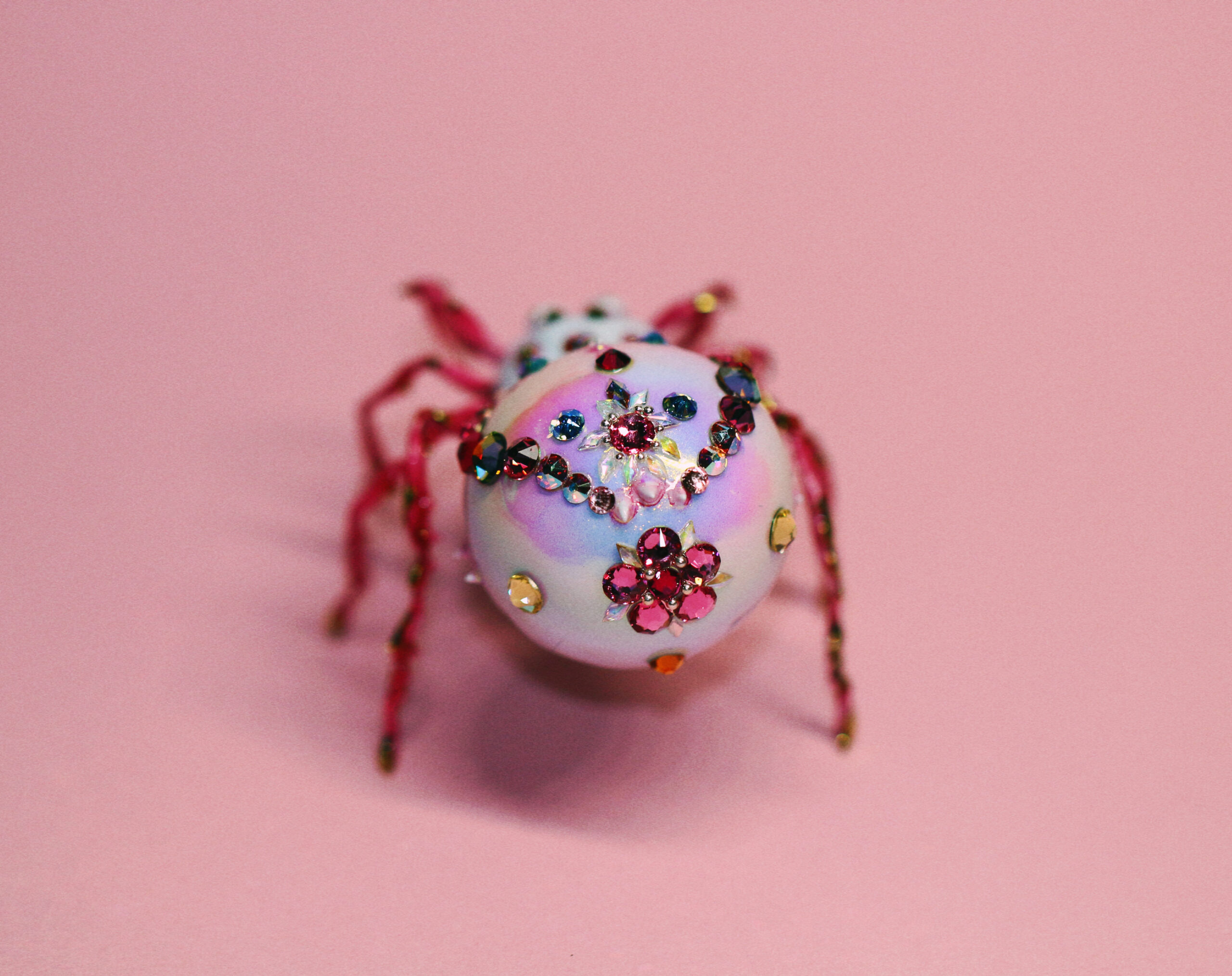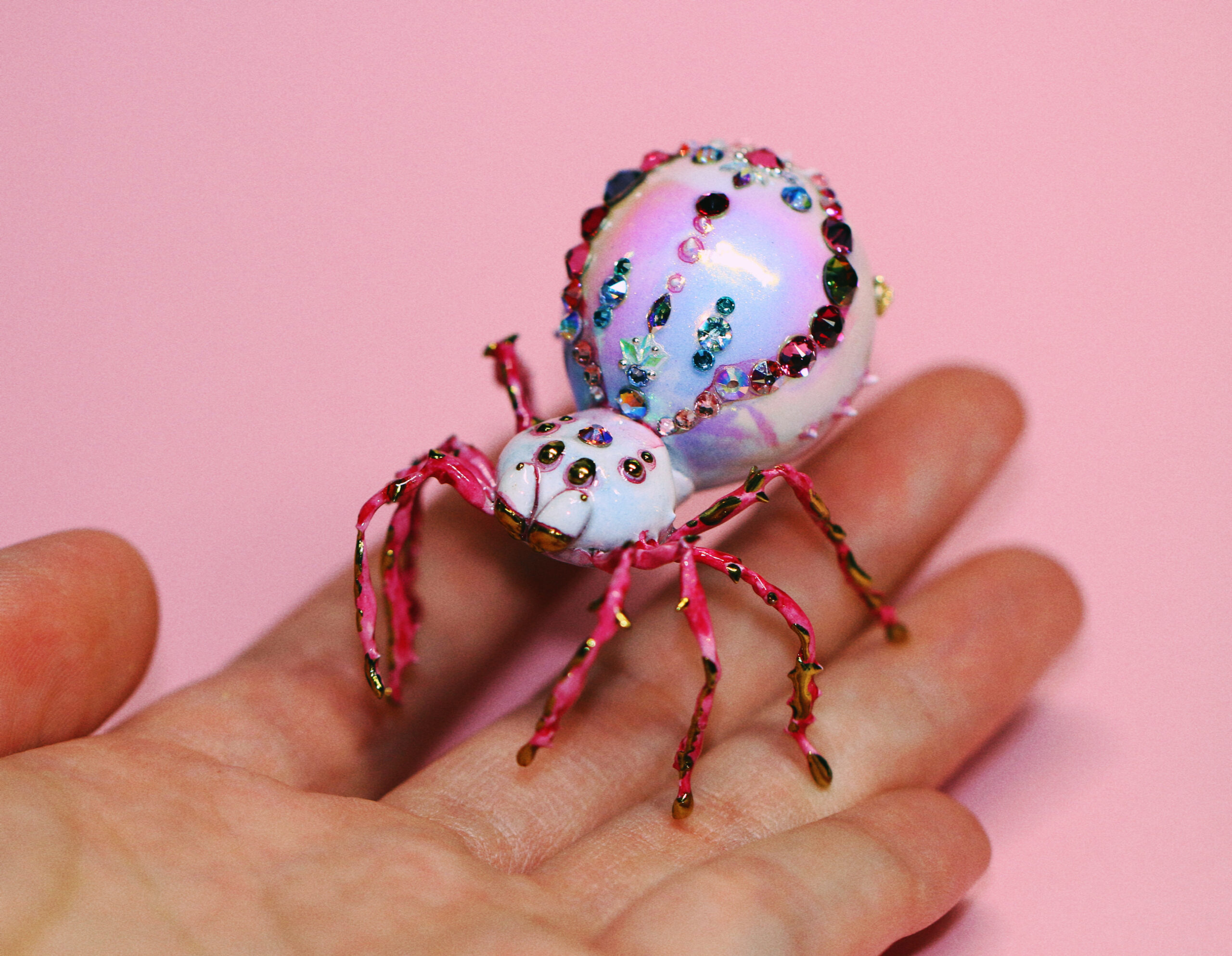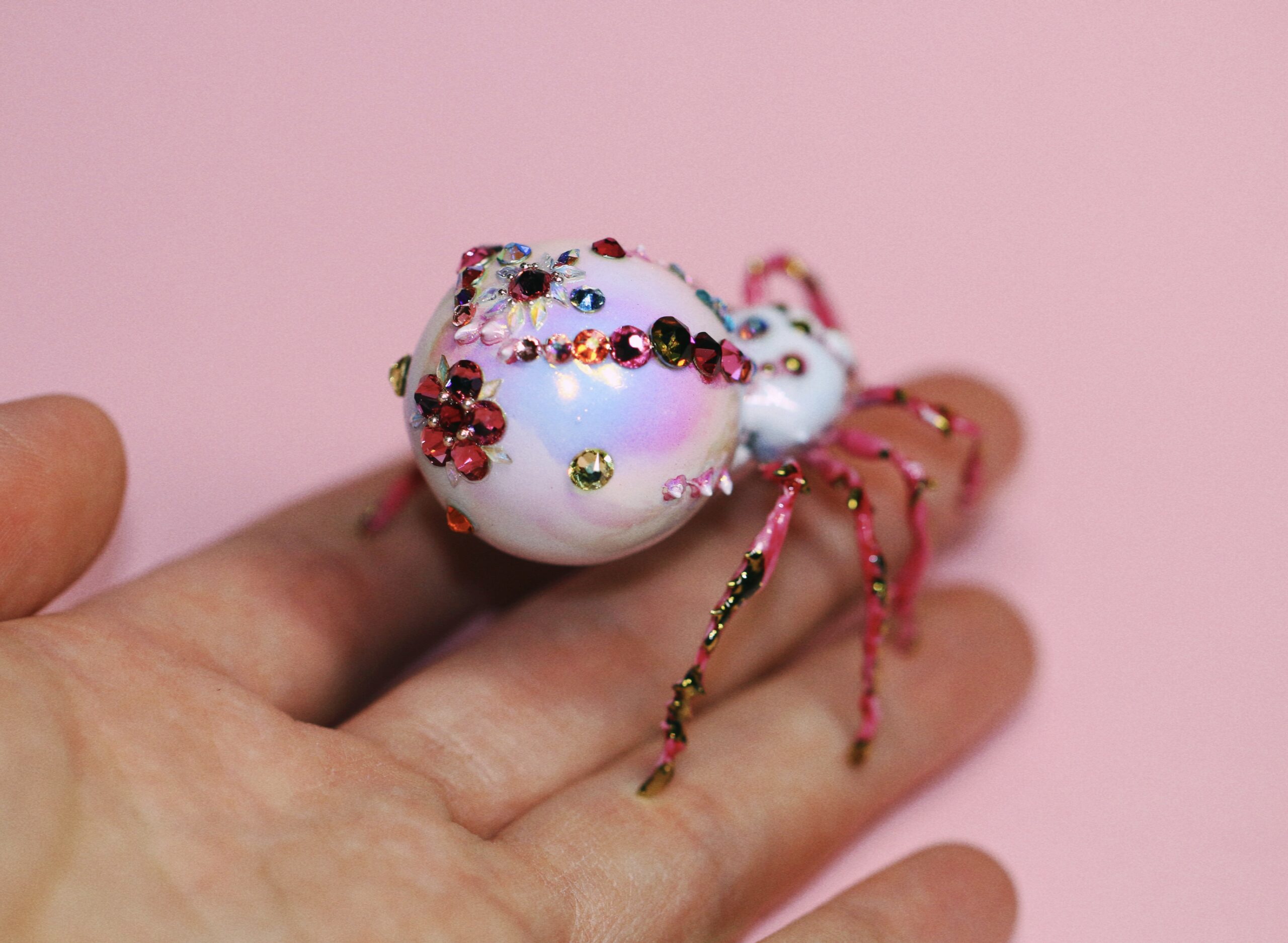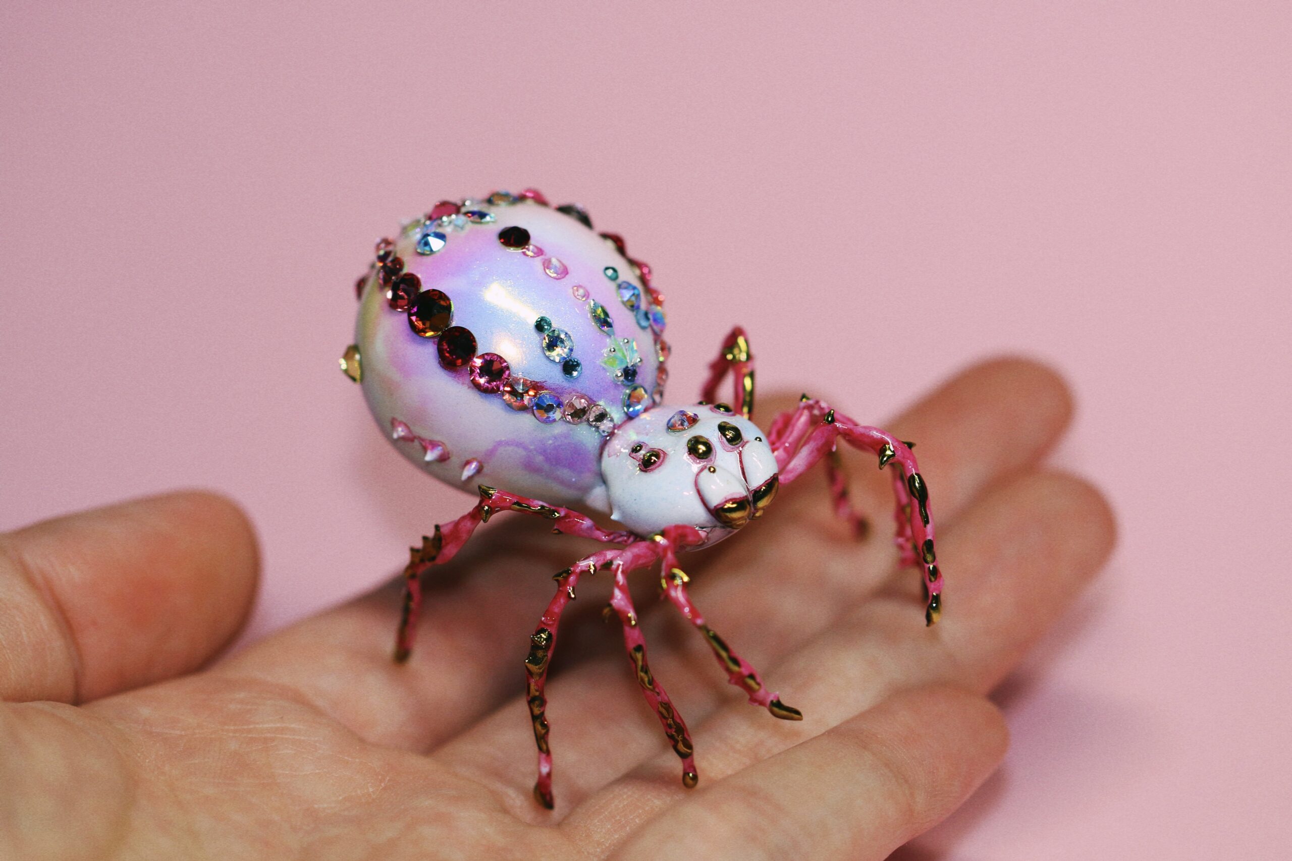 Once, in a quiet corner of a soft pink world, I spent many patient hours placing jewels one by one, letting time move slowly as she came to life. When the jeweled spider finally emerged, she discovered that not everyone loved spiders — but she only tilted her head and kept shining. Every gem on her back is a small spell, a reminder that beauty often appears in unexpected forms.