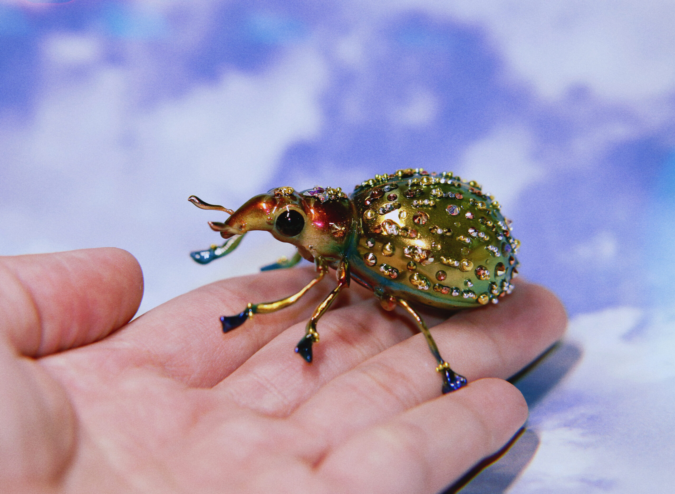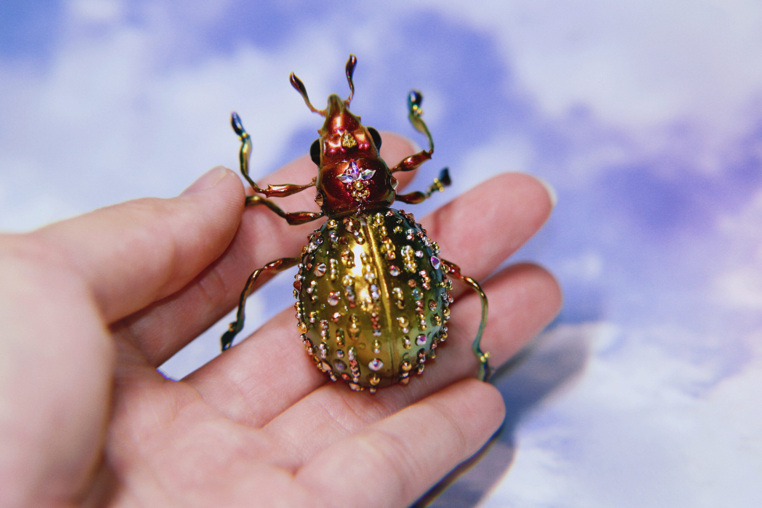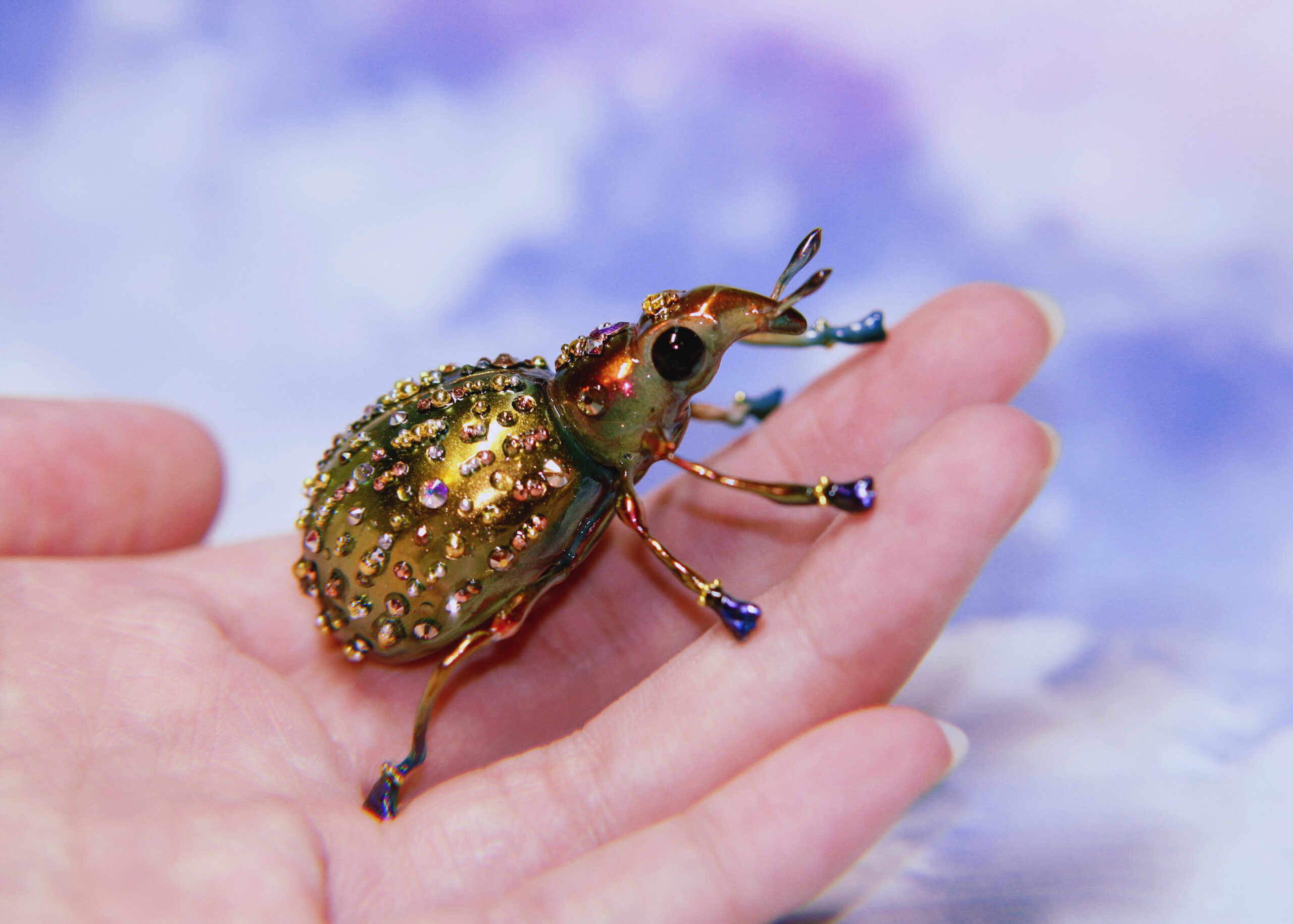 This piece took countless hours of patience, layering, and steady hands to bring to life. Every tiny gem, every gradient of color, and every painted detail was done with extreme care — often taking several tries to get it just right. What may look like effortless beauty now was built through long nights, trial and error, and the quiet rhythm of focus. I wanted this jeweled weevil to feel alive — like a small creature born from dreams and light — and finding that perfect balance between delicate and striking was no easy task. But that’s the magic of creating art: the process tests your limits, and the result reminds you why you never gave up.