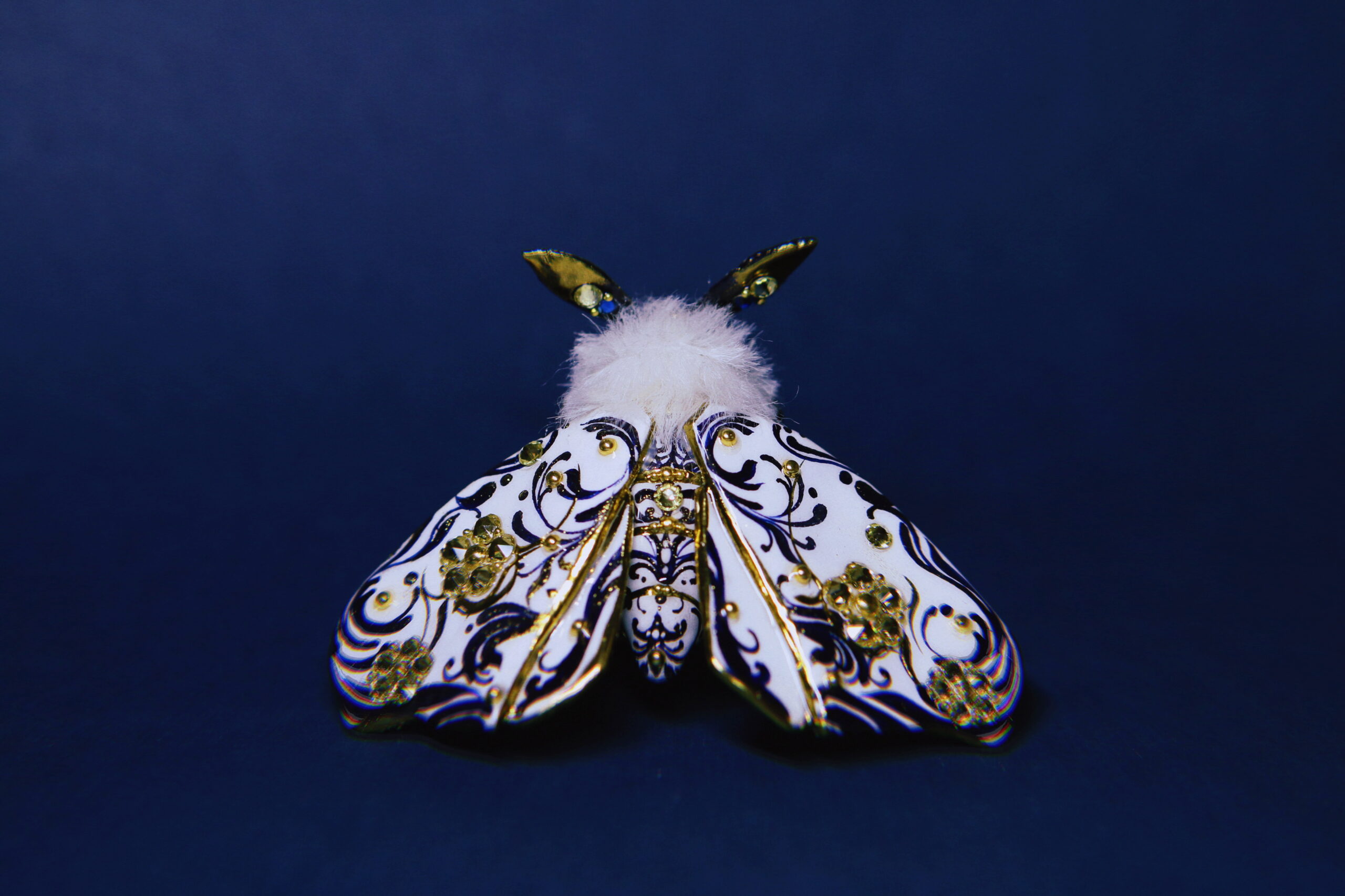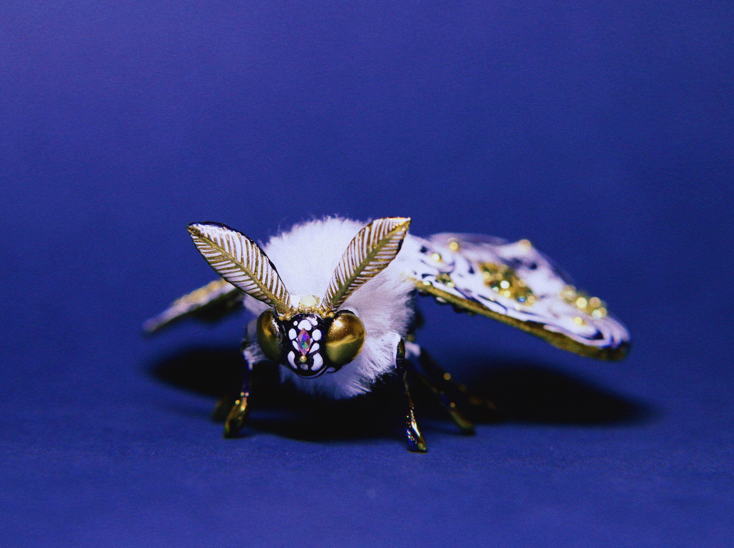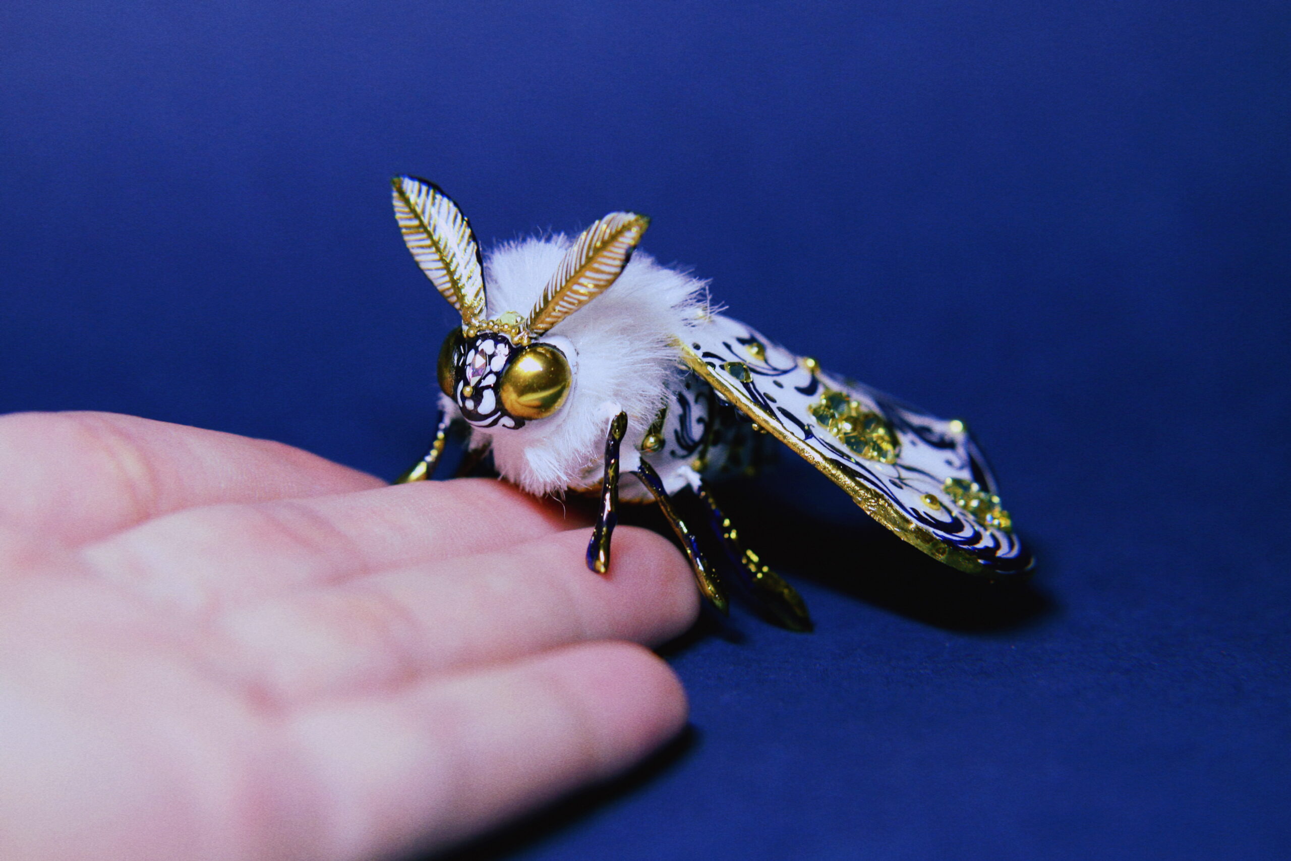 Hand-sculpted with intricate scrollwork, adorned with sparkling rhinestones, and finished in radiant gold chrome — this moth is a true OOAK collectible. Every detail, from its ornate wings to its plush body, was crafted with hours of care and precision.