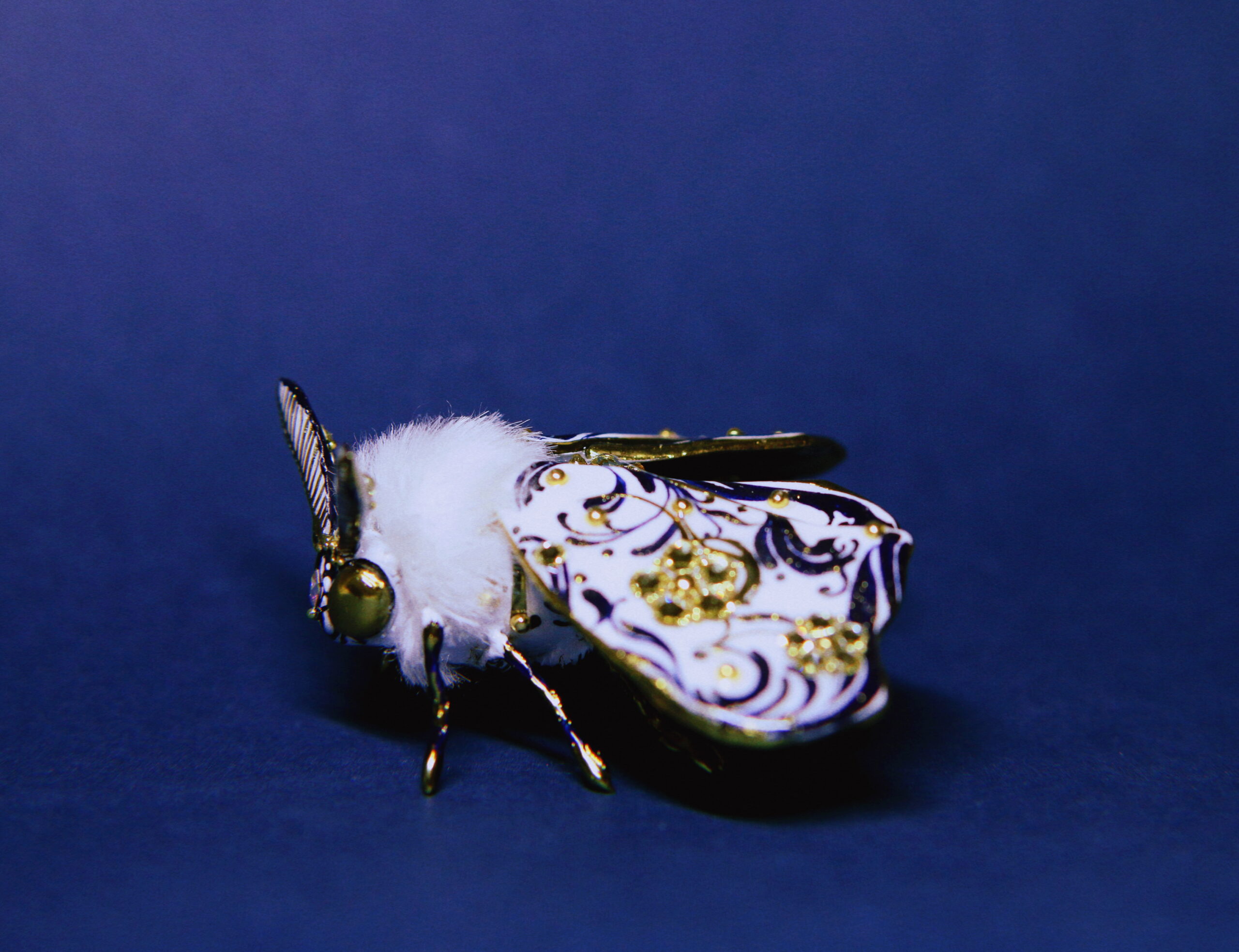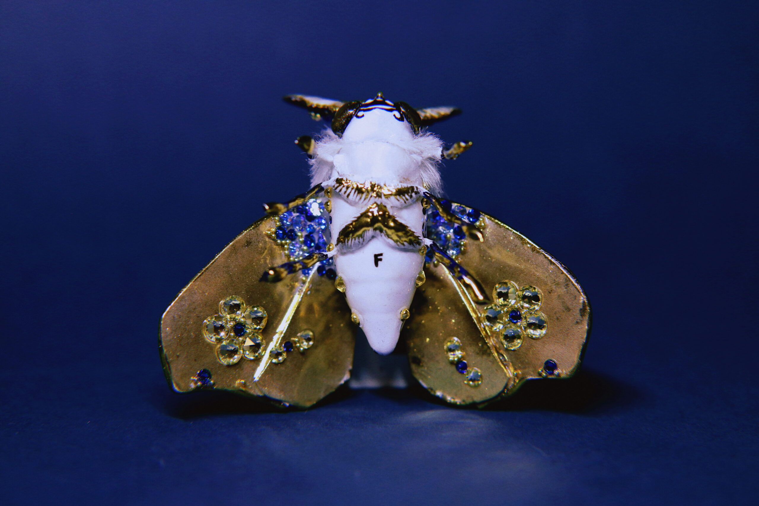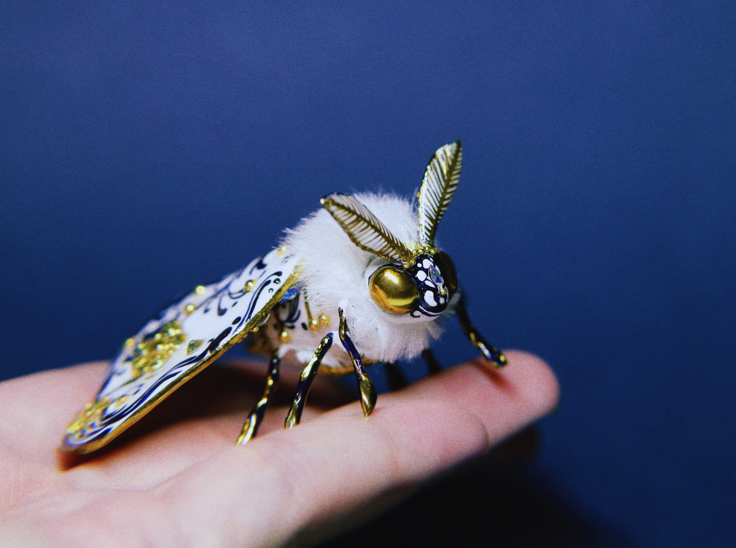 Hand-sculpted with intricate scrollwork, adorned with sparkling rhinestones, and finished in radiant gold chrome — this moth is a true OOAK collectible. Every detail, from its ornate wings to its plush body, was crafted with hours of care and precision.
