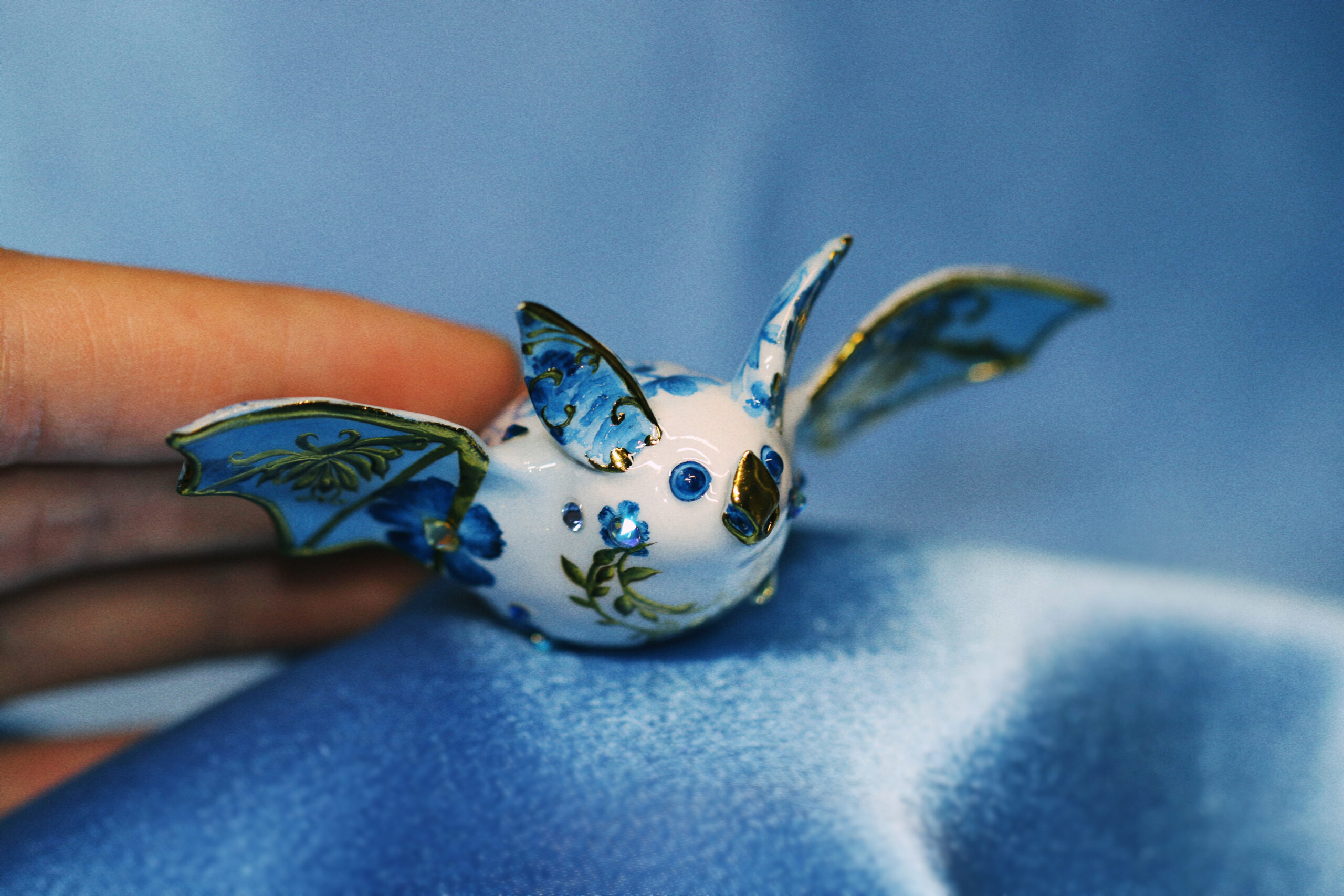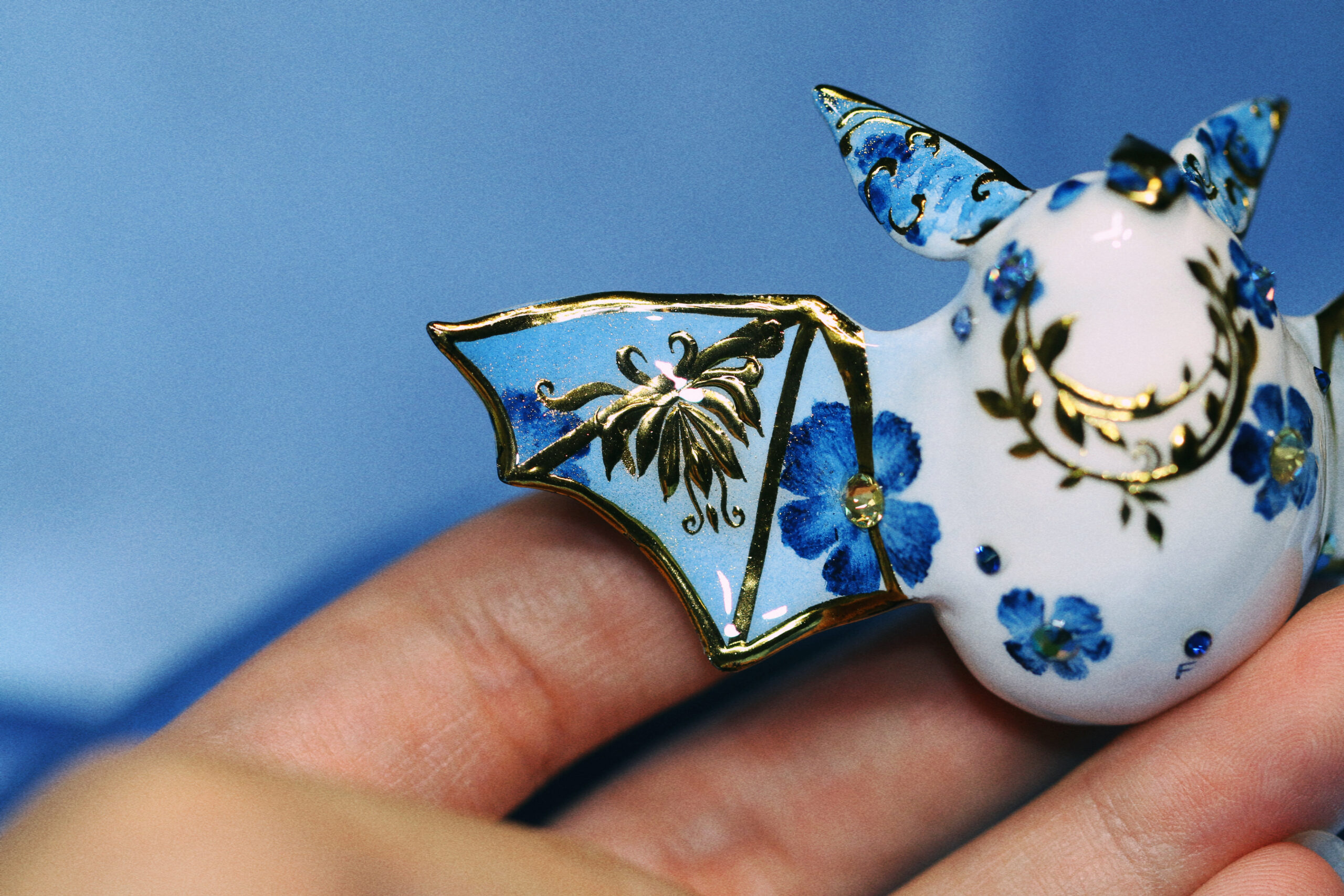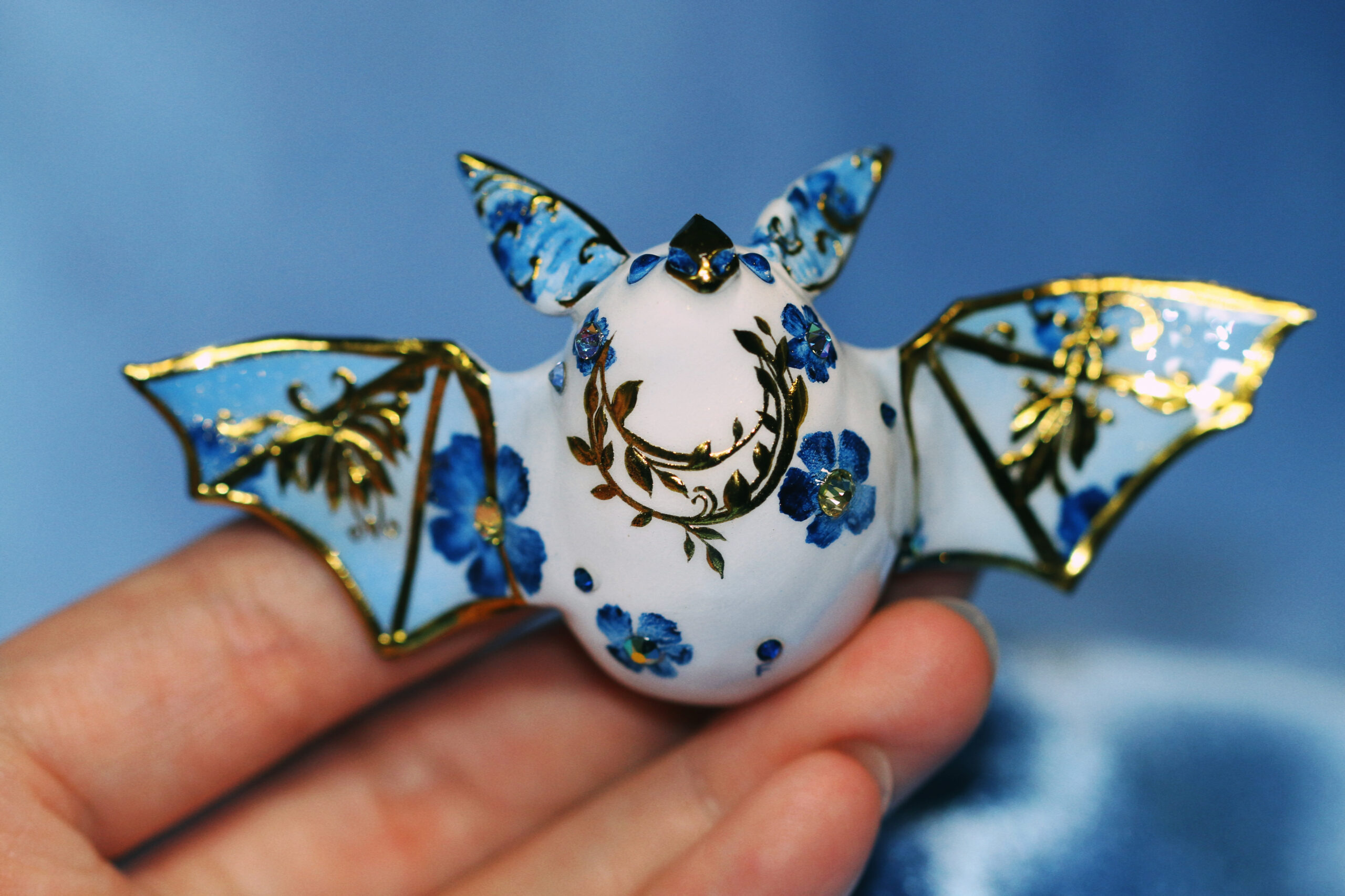 This piece is definitely a unique one for me—I don’t usually create bats, and this one carries an entire botanical garden on her back. I felt it would be unfair to give all the attention to one area, so I extended the design with painted flowers and incorporated a variety of crystals to complement the gold accents.