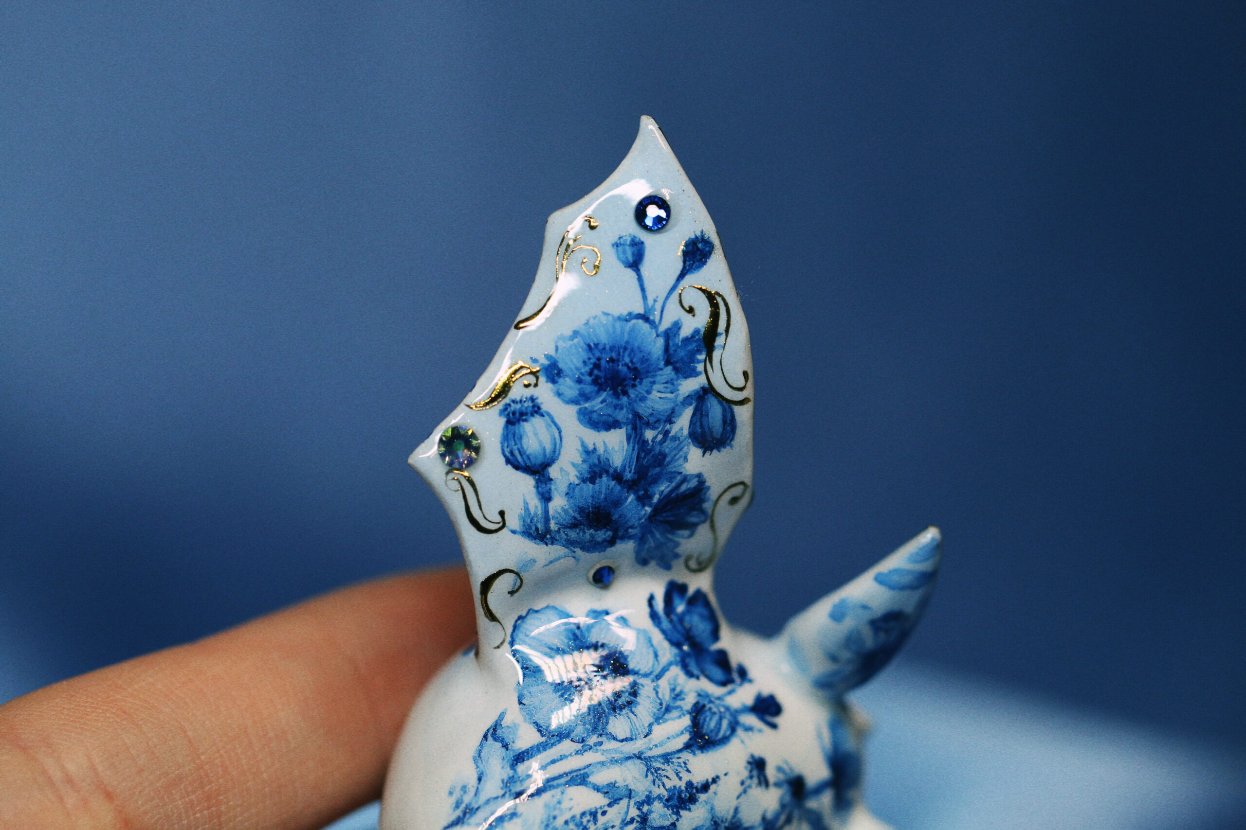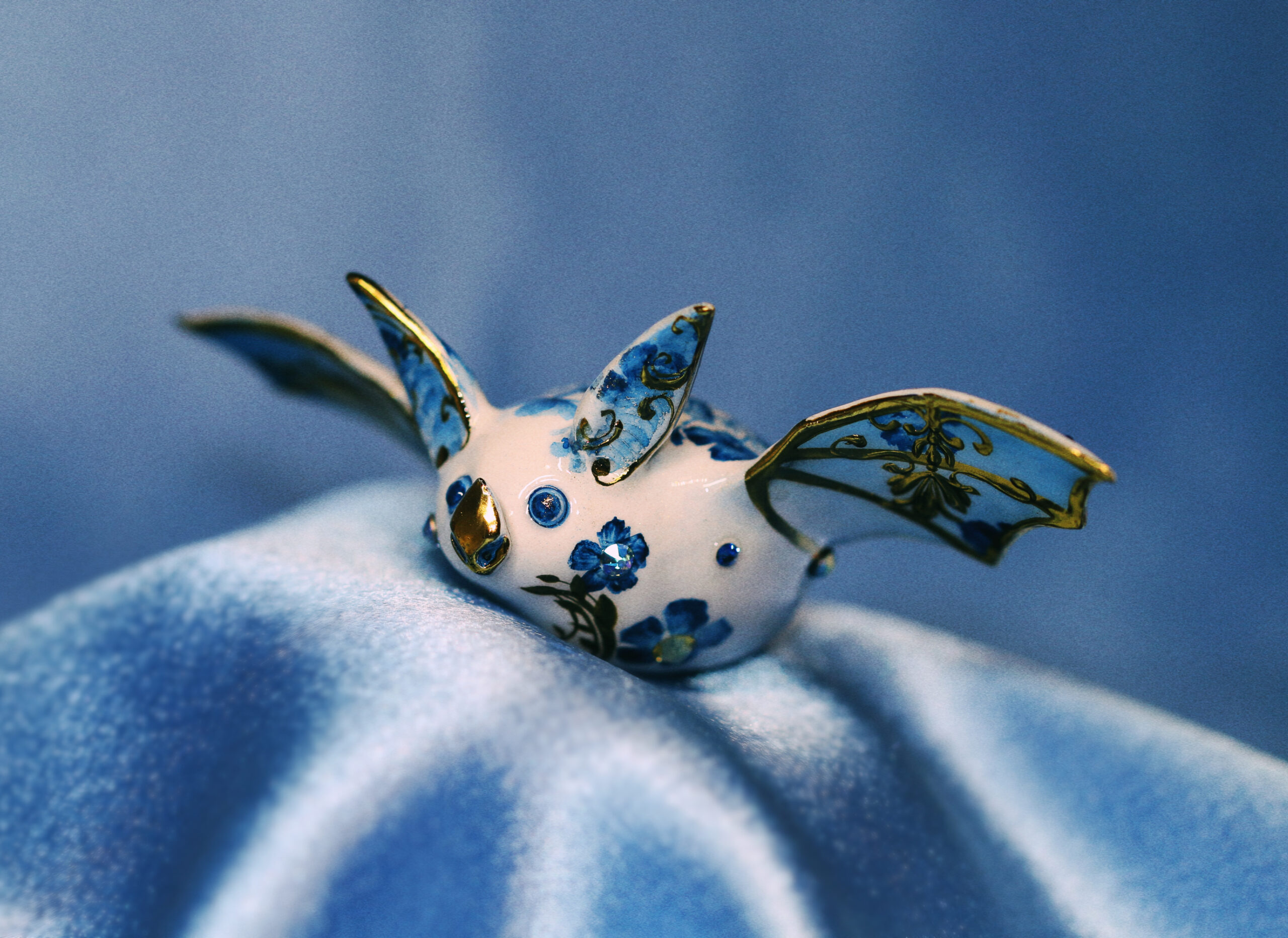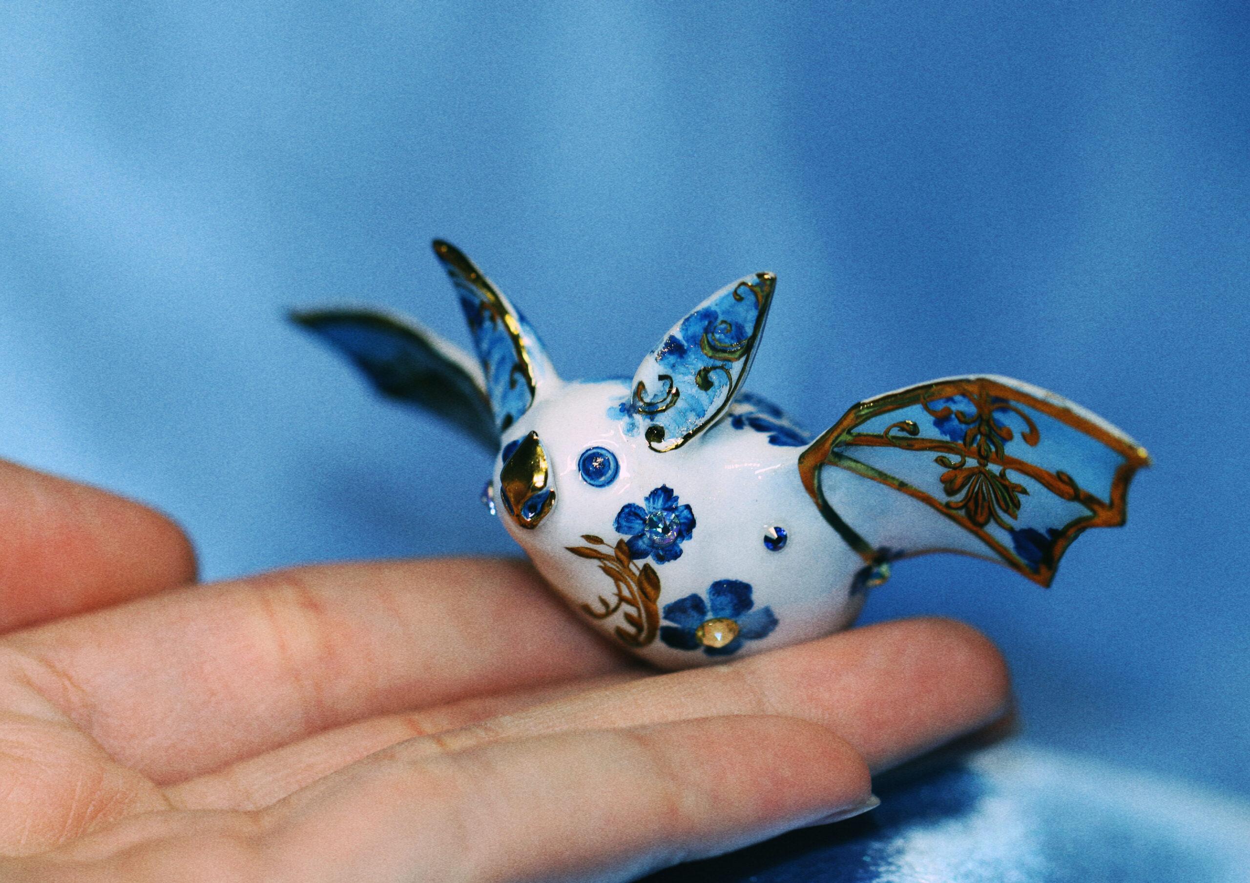 This piece is definitely a unique one for me—I don’t usually create bats, and this one carries an entire botanical garden on her back. I felt it would be unfair to give all the attention to one area, so I extended the design with painted flowers and incorporated a variety of crystals to complement the gold accents.